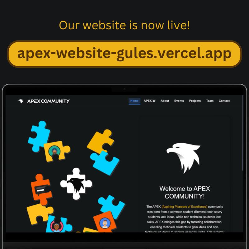 Community PlatformThe APEX (Aspiring Pioneers of Excellence) community was born from a common student dilemma: tech-savvy students lack ideas, while non-technical students lack skills. APEX bridges this gap by fostering collaboration, enabling technical students to gain ideas and non-technical students to acquire essential skills. This synergy cultivates an environment where visionary ideas become impactful realities.