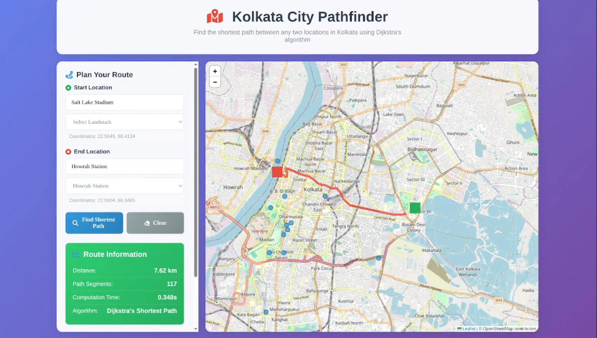 Web ApplicationA modern, interactive web application for finding shortest paths in Kolkata using Dijkstra's algorithm. It features an interactive Leaflet-based map with OpenStreetMap tiles, allowing users to select locations directly on the map or use text input. The application visualizes paths in real-time, displays distance, path segments, and computation time.